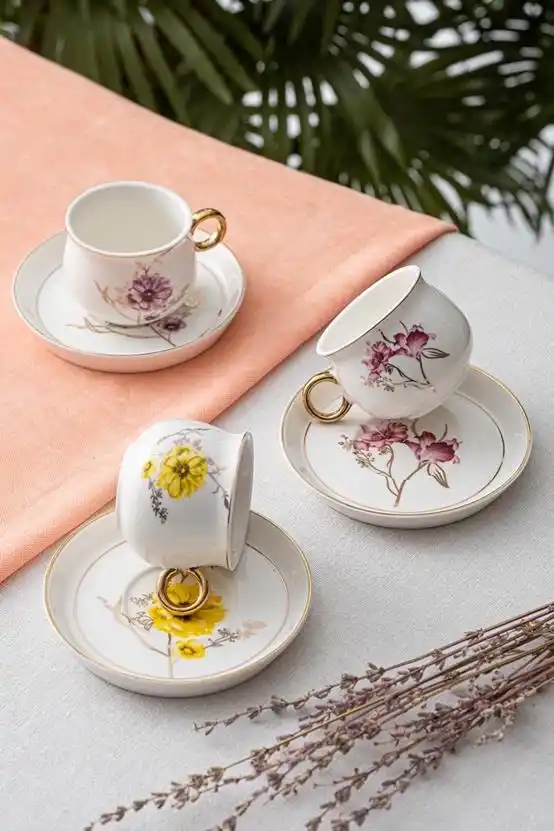 Dayanıklı porselen yapısı, uzun ömürlü kullanım sunar. İnce kenarlı ve ideal hacimli fincanlar sayesinde Türk kahvesi veya espresso keyfi daha konforlu hâle gelir. Şık desen ve renk seçenekleriyle her sofraya uyum sağlar.