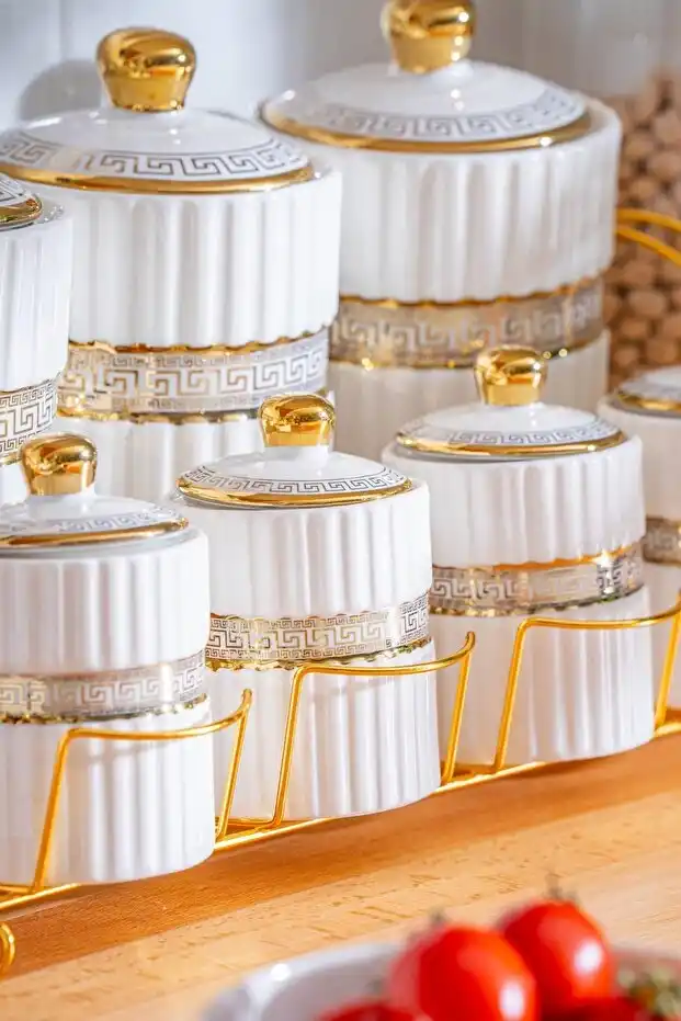 Acar Eva Gold Metal Standlı Baharatlık 7’li, mutfakta düzeni ve şıklığı bir arada sunan kullanışlı bir baharat setidir. Metal standlı yapısı sayesinde tezgâh üzerinde düzenli bir görünüm oluştururken, porselen kavanozları ile estetik ve fonksiyonel bir kullanım sağlar.