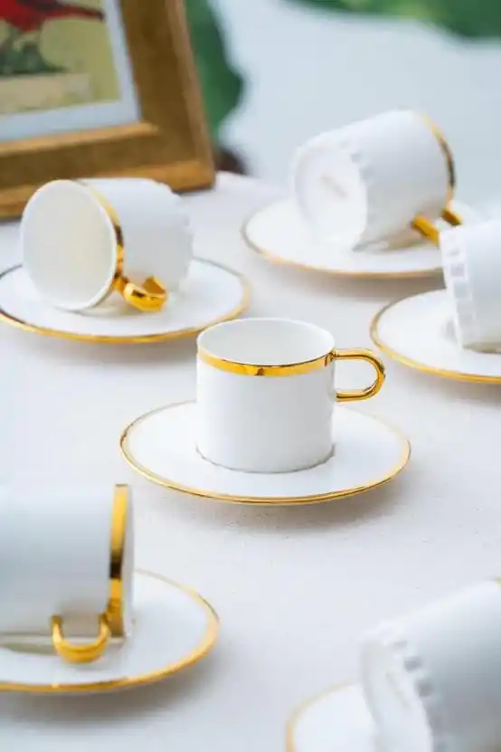 Acar HXF6921 Gold Detaylı Porselen Kahve Seti 6'lı, klasik ve modern çizgileri bir araya getirerek kahve sunumlarını daha zarif ve özel hâle getirir.