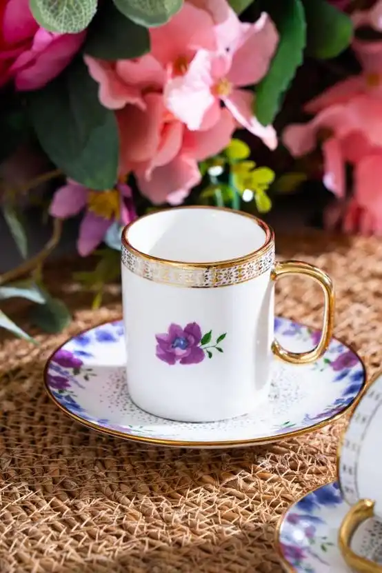 Acar KAI6901 Mor Çiçek Desenli Gold Detaylı Beyaz Porselen Kahve Seti 2'li