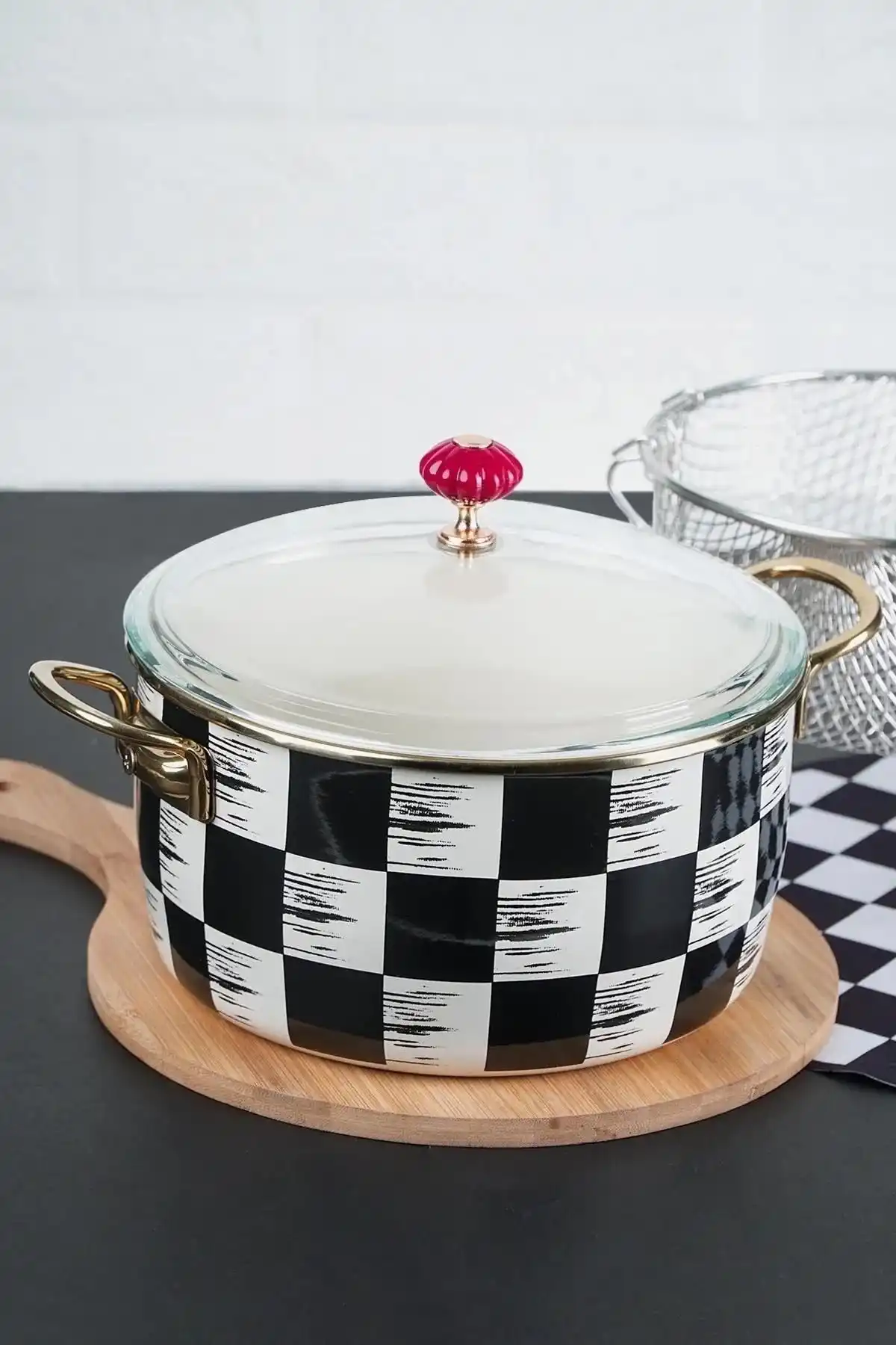 22 cm çapıyla farklı yemek ve kızartmalar için uygun boyut sağlar. Dama desenli tasarımı, mutfakta şıklığı ve estetiği bir araya getirir. Temizliği kolay ve uzun ömürlü kullanımı sayesinde mutfakta hem işlevsel hem de dekoratif bir kullanım sunar.