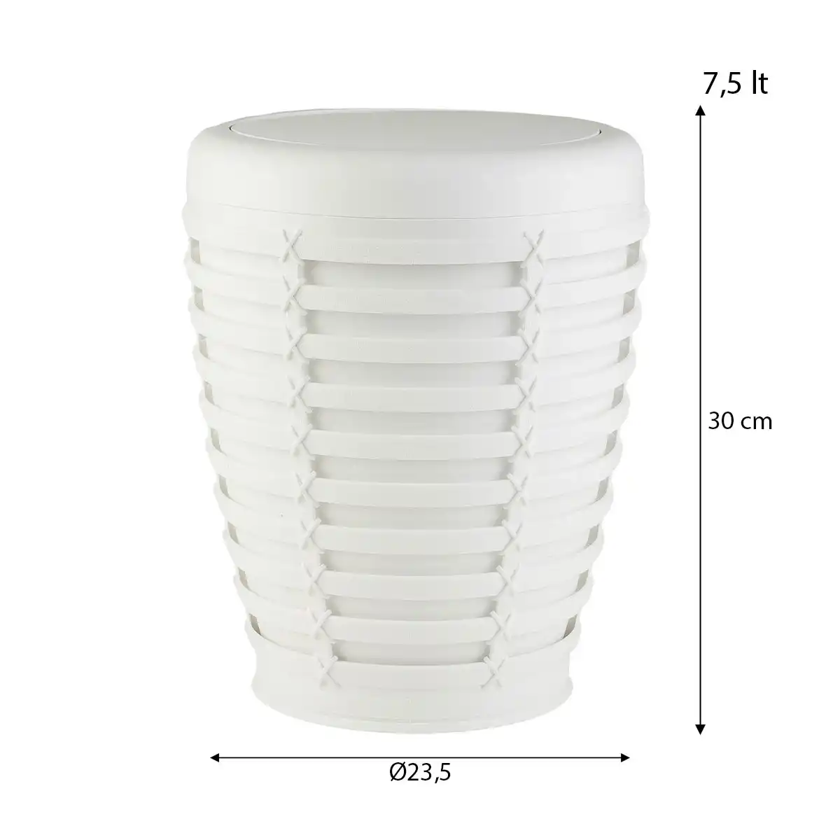 Beyaz tasarımıyla banyonuza modern ve temiz bir görünüm kazandırır.Dayanıklı plastik malzeme, uzun süreli kullanım sağlar. 23,5 x 30 cm ölçüleri ve 7,5 L kapasitesi, günlük kullanım için ideal hacim sunar. Kompakt yapısı sayesinde banyonuzda pratik kullanım imkânı verir.