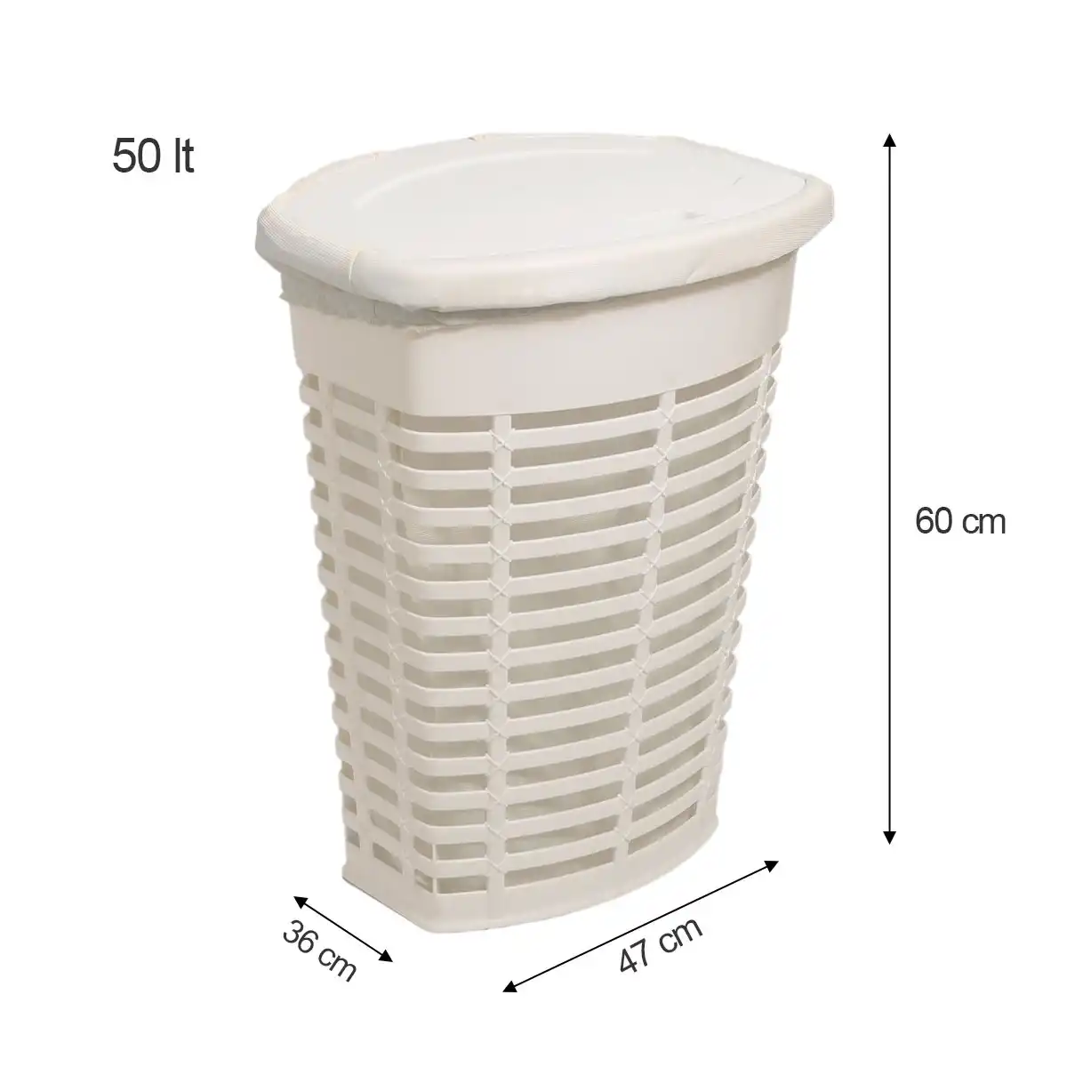 Bej tasarımıyla modern ve sıcak bir görünüm sunar.Dayanıklı plastik malzeme, uzun süreli kullanım imkânı sağlar. 50 L kapasitesi ve 47 x 36 x 60 cm ölçüleri, geniş hacmiyle evdeki çamaşırları pratik ve düzenli şekilde saklamanızı sağlar. Hafif ve kompakt yapısı sayesinde taşınması ve yerleştirilmesi kolaydır.
