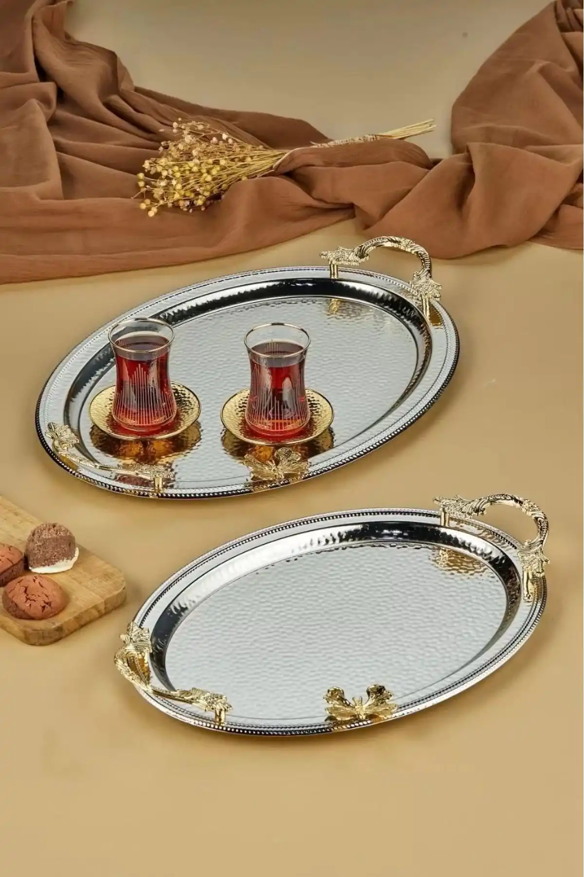 Estetik görünümü ve dayanıklı yapısıyla Cooker CKR3251 Oval Kelebekli Metal Tepsi 2’li, hem günlük kullanım hem özel davetler için sofralarınızın vazgeçilmez bir parçası olacaktır.