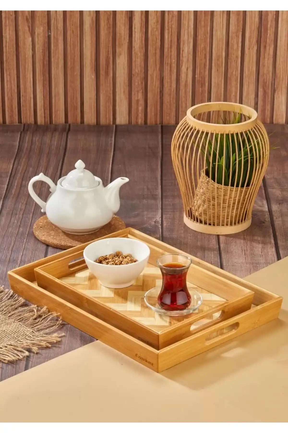 Doğal bambu dokusu, estetik ve sıcak bir sunum sağlar. Hafif ve ergonomik tasarımı sayesinde taşıma ve servis kolaylığı sunar. Büyük boyutuyla çok sayıda yiyeceği aynı anda sunmanıza imkân verir.