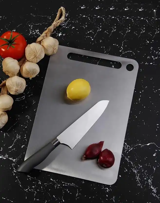 Cooker Çelik Kesim Panosu, yüksek kaliteli paslanmaz çelikten üretilmiş, uzun ömürlü ve hijyenik bir kesim yüzeyi sunan pratik bir mutfak aracıdır. Sebze, meyve, et veya hamur işlerini kesmek için ideal bir kullanıma sahiptir.