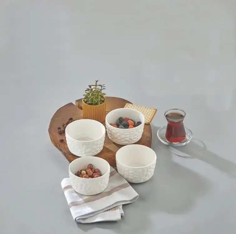 Set içerisinde 4 adet porselen çerezlik bulunur. Modern tasarımı, sofralarınıza zarif ve dekoratif bir görünüm kazandırır. Kuruyemiş, lokum, draje ve atıştırmalıklar için ideal bir kullanım sunar.