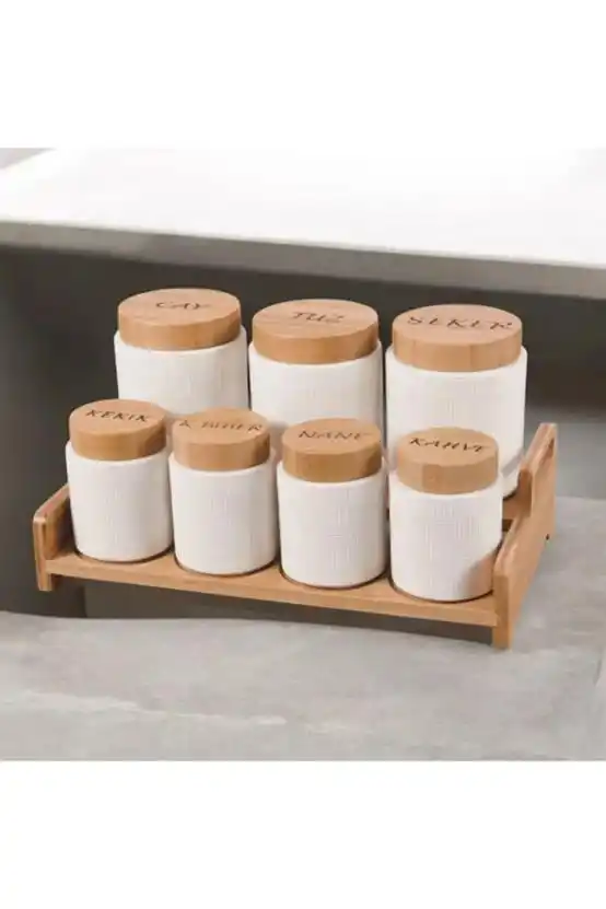 Bu bambu kapaklı porselen baharatlık, mutfakta hem fonksiyonel hem de dekoratif bir seçenek olarak şıklık ve düzen sağlar.