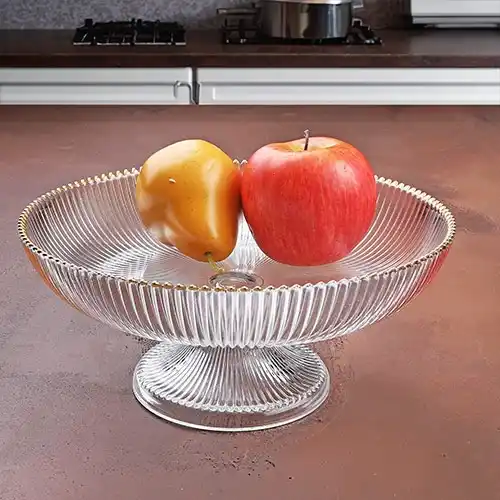 Şık ve Zarif Tasarım:Kosova Gold Detaylı Ayaklı Cam Meyvelik 25 cm, altın detayları ve modern tasarımıyla sofralarınıza lüks bir dokunuş katar.