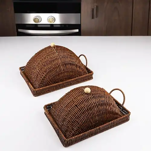 Ev ve mutfakta şık ve fonksiyonel bir saklama çözümü sunan Kosova SPT279.B Büyük Boy Kapaklı Rattan Tepsi, ekmek, meyve veya çeşitli atıştırmalıkları düzenli ve estetik bir şekilde saklamanıza yardımcı olur. Dayanıklı rattan malzemesi, uzun ömürlü kullanım ve doğal dekoratif görünüm sunar.