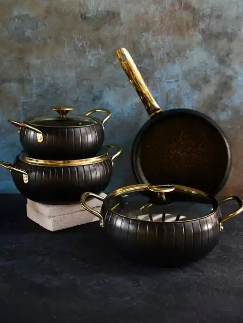 Oms 3528.SYH Meridian Siyah Gold Tencere Tava Seti 7 Parça