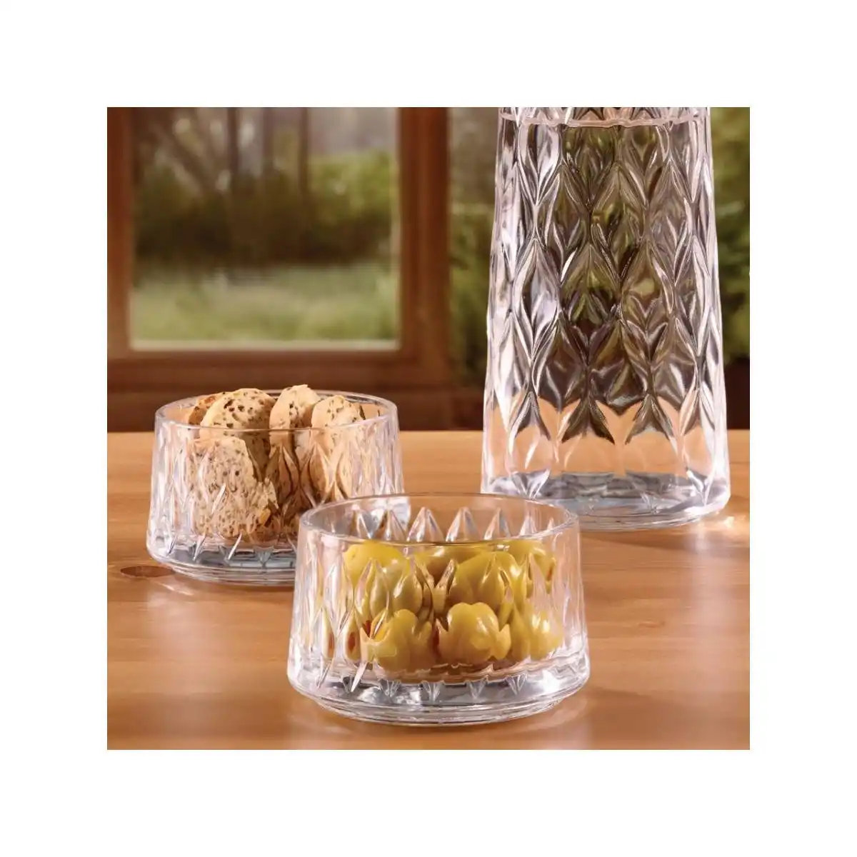 Dayanıklı cam malzeme, hem ev hem de işletme kullanımı için uygundur. Şeffaf yapısı sayesinde içerisindeki ürünleri rahatlıkla görebilir, estetik ve modern tasarımıyla sofralarınıza zarif bir dokunuş katar.